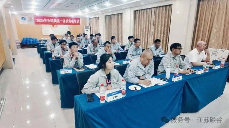 江蘇磁谷成功承辦某央企環保公司《永磁調速一體機工廠生產線實操培訓》,為期3天的深度技術研修于6月20日圓滿收官。本次培訓集結了該企業技術骨干20余人,通過"理論+實踐+研討"三維賦能模式,重點圍繞永磁調速一體機的技術原理、結構組成、性能特點及應用領域、操作規范、檢修維護及故障排查等核心內容展開,培訓內容豐富、培訓形式多樣,同時開展了實操技術比武和理論考核,保障了培訓效果,為國產永磁裝備制造注入新動能。 培訓亮點之前沿技術拓展視野 永磁調速一體機作為新型節能設備,能精準調速匹配負載,實現節能減排、降本增效。公司專業講師深入講解,讓學員深入了解該領域前沿技術,拓寬了技術視野。